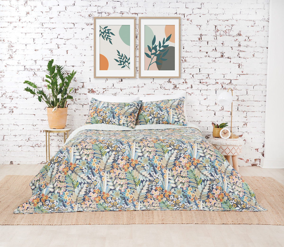 The Posy quilt set features blooming flowers in hues of yellow, melon and green against a rich indigo background. The "flip side" is a soft green botanical print offering even more year round styling possibilities.