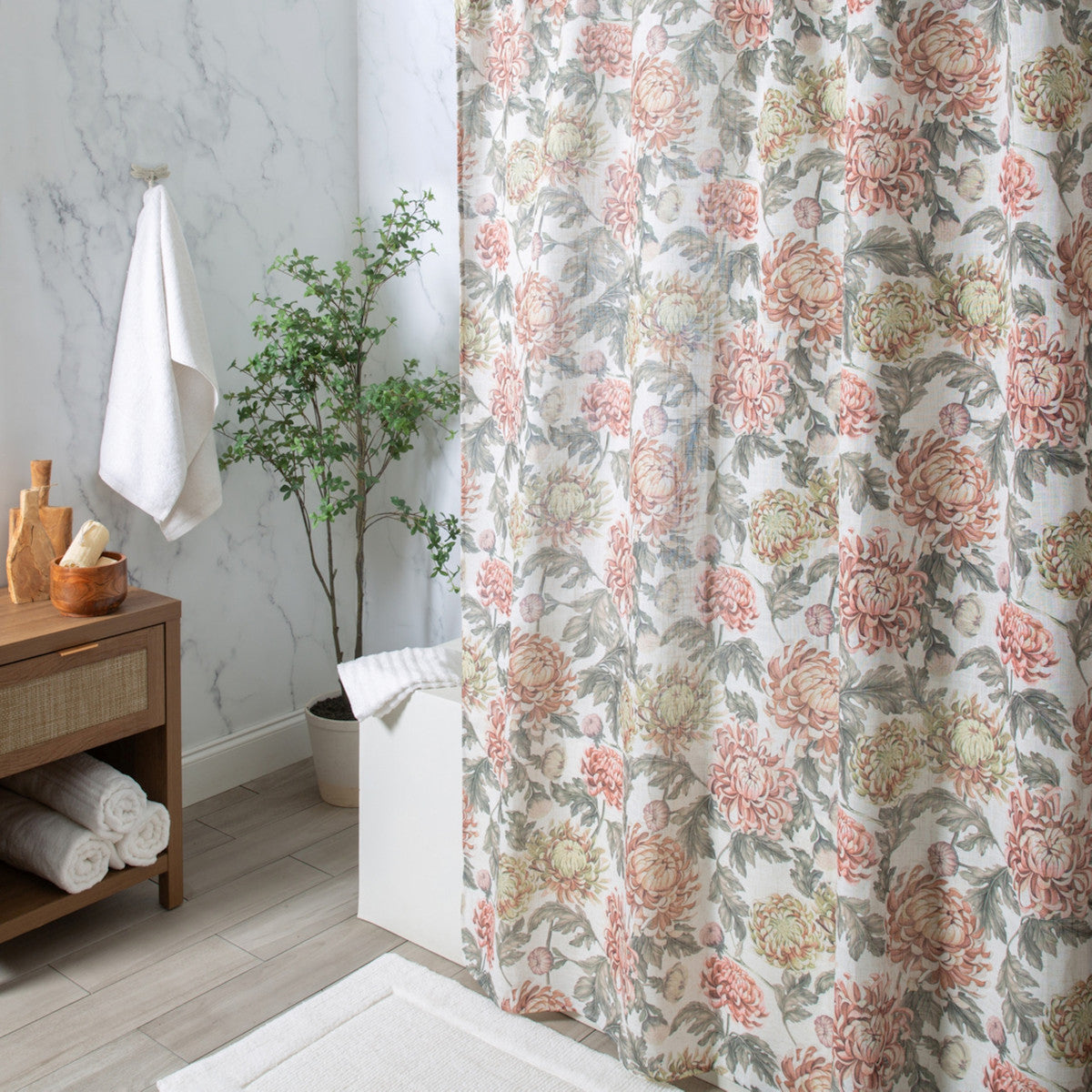 The Fall Peony shower curtain is a beautiful floral print on a linen polyester blend fabric in shades of pink, green, yellow & ivory. It will definitely make a stunning statement to your bathroom.