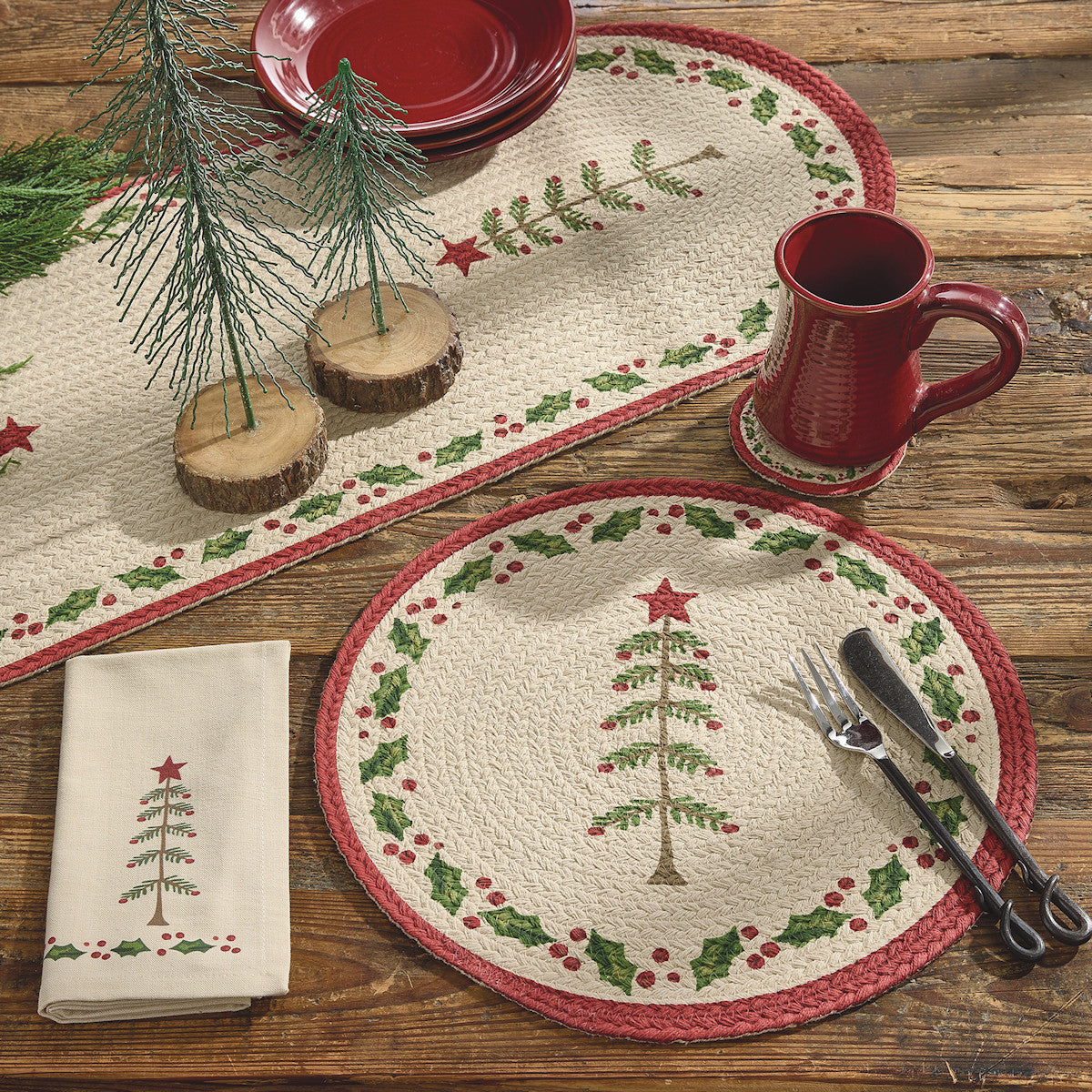 Decorating your holiday table this season will be made simple with the Feather Tree Braided table linen collection. All are made from a durable, easy care cotton and features a festive, old fashioned feather tree accented by holly berry and a red border.