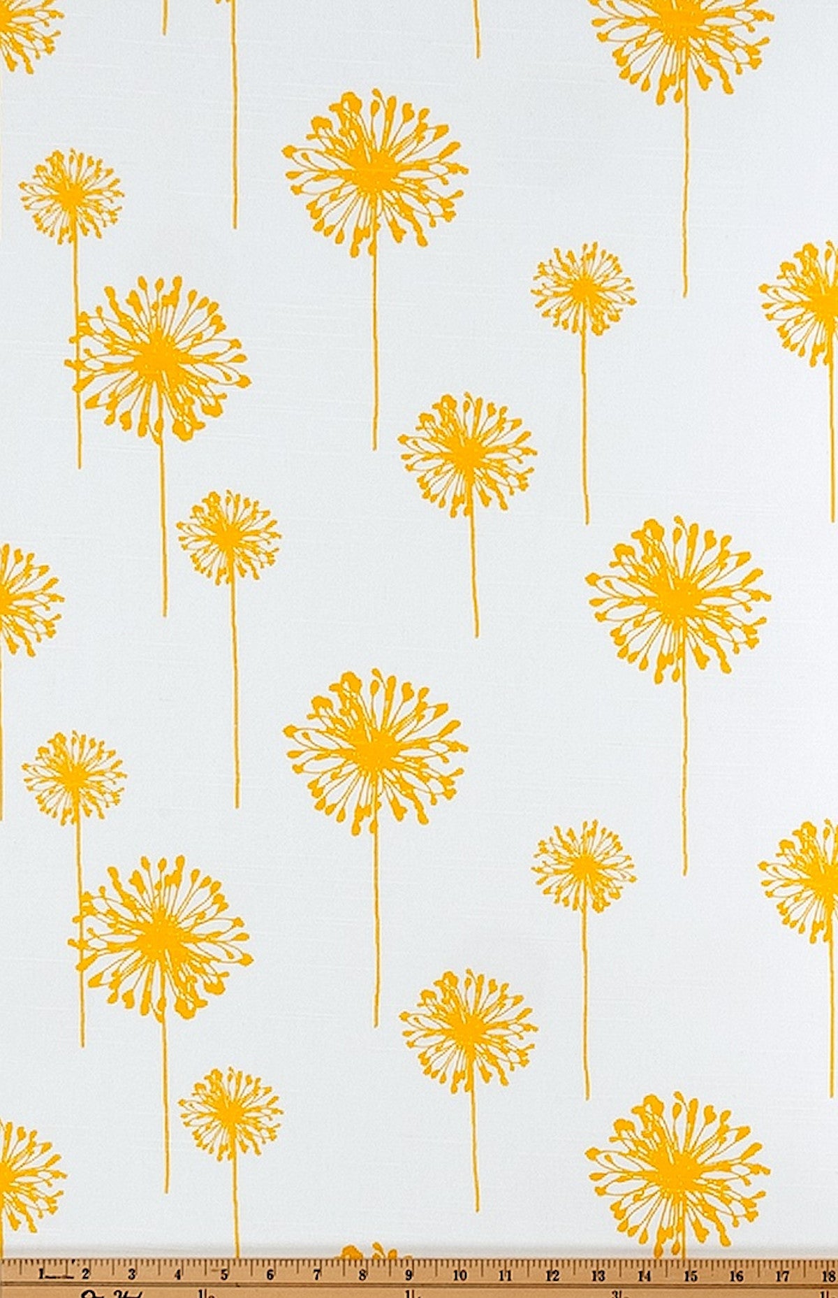 This fun fabric from Premier Prints features scattered yellow dandelions printed on a white background. Made from cotton, it would be perfect to use for window treatments, bedding, decorative pillows or other medium weight upholstery.
