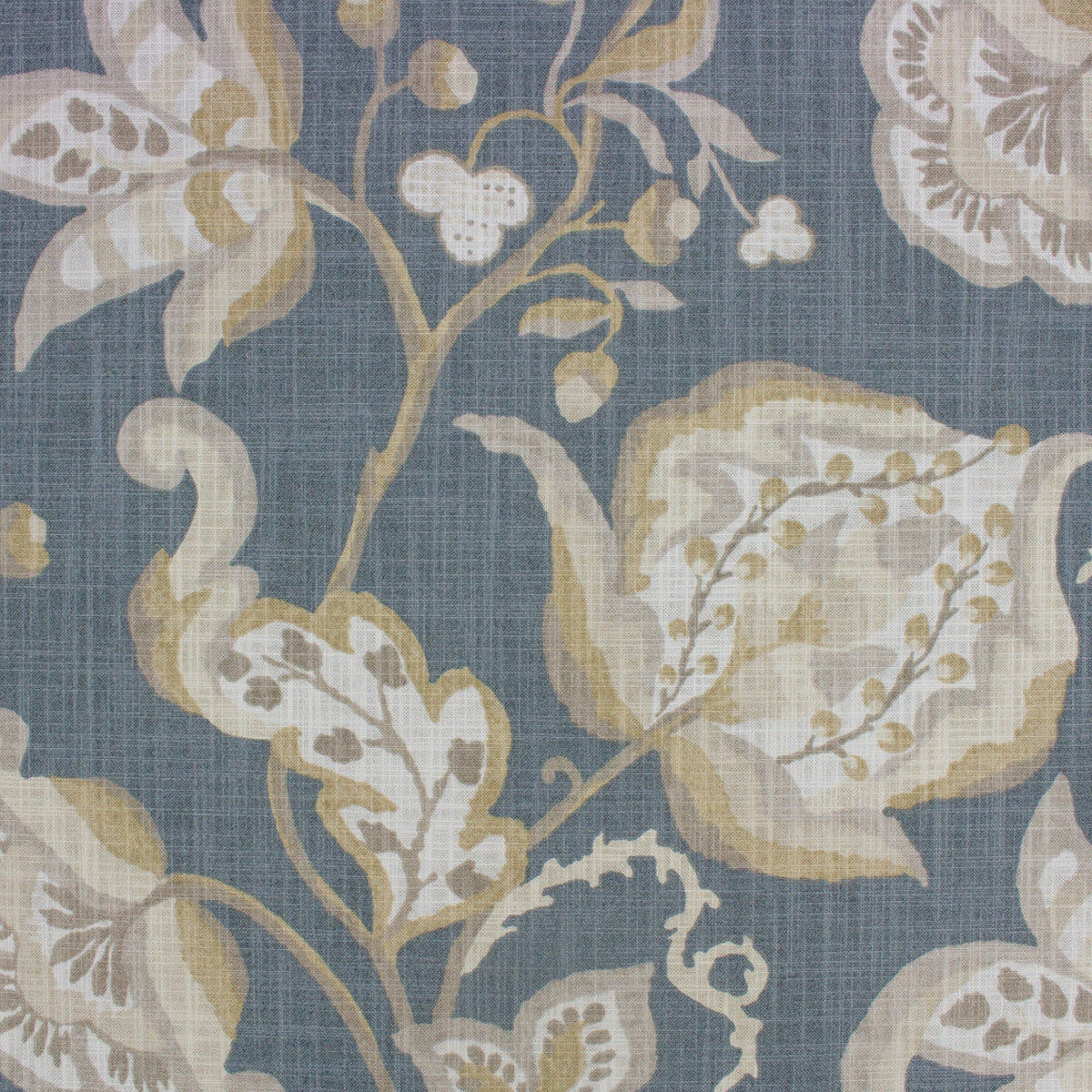 This transitional floral pattern is printed on a soft but durable cotton fabric. It features hues of taupe, tan & white on a slate blue background. Its multi purpose usage includes window treatments, bedding, decorative toss pillows and so much more.